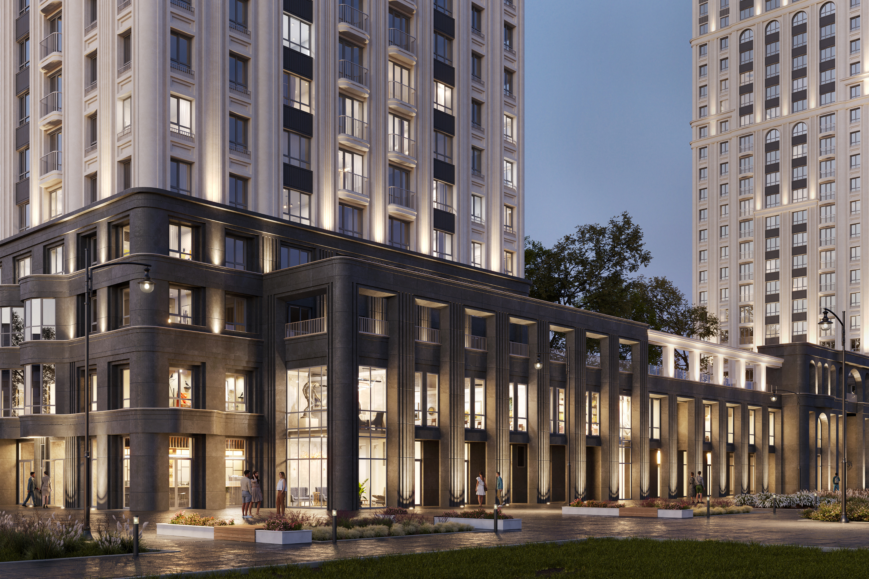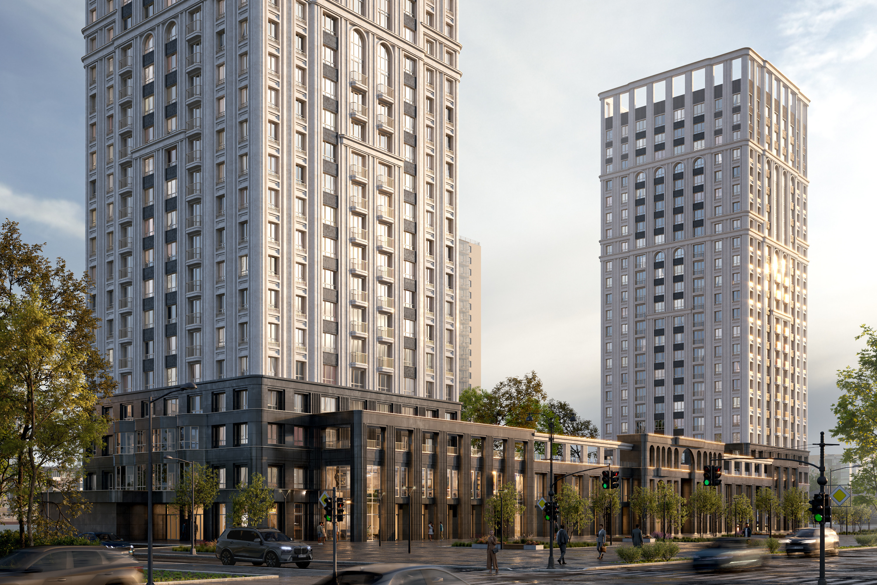 - Два 24-этажных дома, нижные ярусы объеденены двухэтажным стилобатом. Фасады башен выполнены в стиле ар-деко. В галерее планируется пространство для ресторанов, фитнес-центра, супермаркетов, салонов красоты.